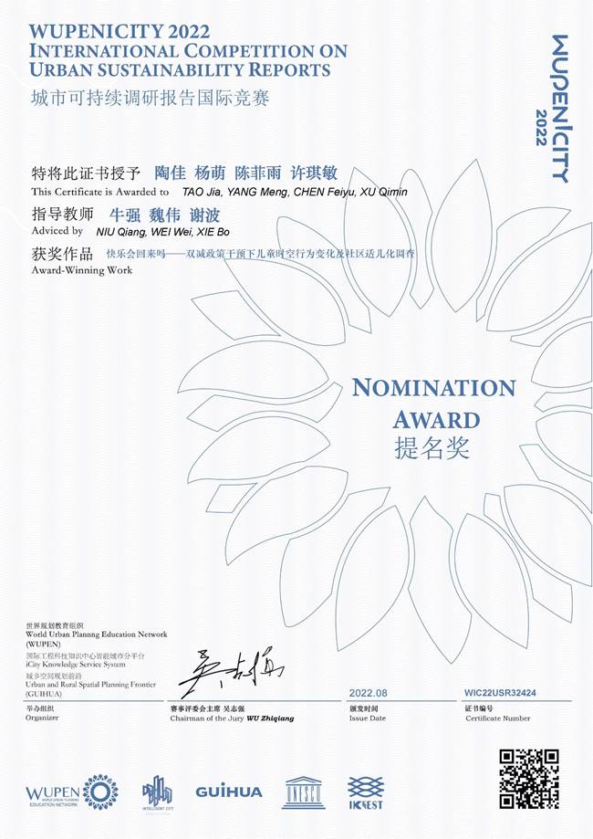 WUPENiCity城市可持续调研报告和城市设计学生作业国际竞赛,是目前国内城乡规划专业级别最高、最权威的竞赛,是面向全球所有设置城乡规划及相关专业的高校发布的赛事,其前身是全国高等学校城乡规划专业指导委员会举办的学生作业评优,2020年升级为世界规划教育组织举办的国际竞赛。据悉,本次赛事共收到814份参赛作品,竞赛设置一等奖、二等奖、三等奖、提名奖、人气奖五类奖项,最终遴选出一等奖8份,二等奖28份,三等奖48份,提名奖111份(含一、二、三等奖),人气奖正通过在线投票甄选。